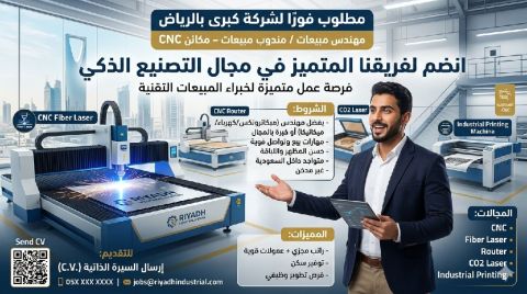 مطلوب مهندس / مندوب مبيعات - مكائن CNC شركة كبرى مقرها الرياض حي الروضة تطلب مهندس مبيعات أو مندوب مبيعات في مجال مكائن CNC، الفايبر لايزر، الراوتر، لايزر CO2، ومكائن الطباعة الصناعية الشروط يفضل مهندس (ميكاترونكس / كهرباء / ميكانيكا) أو خبرة بالمجال مهارات بيع وتواصل قوية حسن المظهر واللباقة غير مدخن المميزات راتب مجزي + عمولات قوية توفير سكن فرص تطوير وظيفي للتقديم أرسل CV