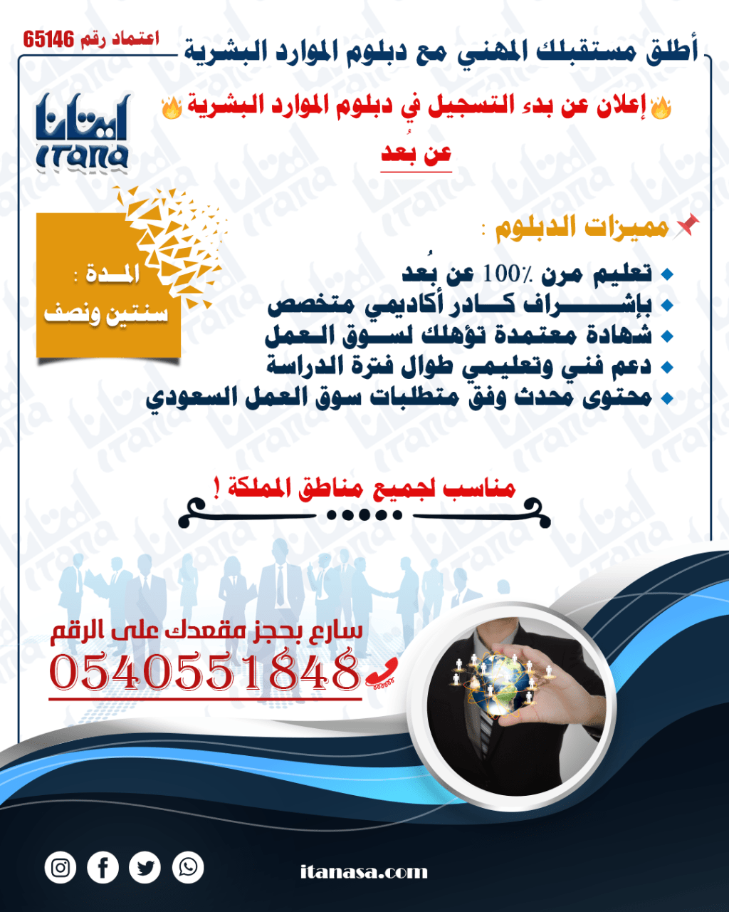 Accredited Human Resources Diploma - Registration Now Open Etana Higher Institute for Training is pleased to announce the opening of registration for the Accredited Human Resources Diploma Program, delivered fully online over 2.5 years, under the official accreditation number 65146. Program Highlights 100% online study Supervision by qualified academic specialists Officially accredited certificate