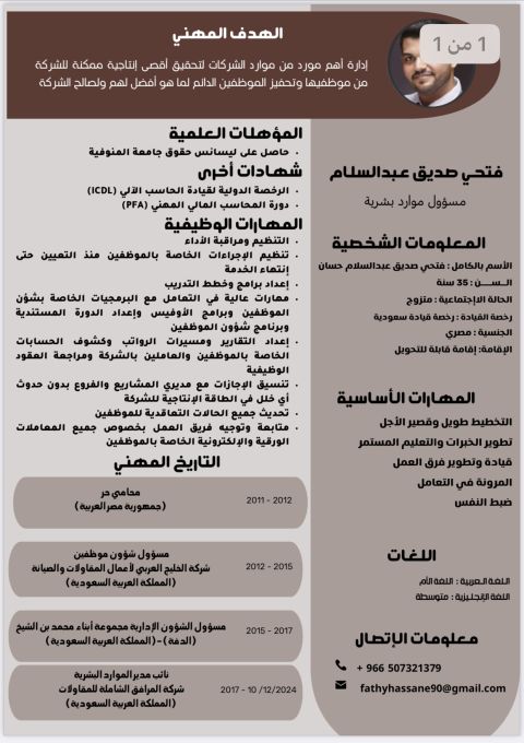 موارد بشرية وشؤون موظفين حاصل على ماجستير علوم اداريه وماجستير قانون معرفة تامة بشؤون الموظفين وعقود عملهم ومتابعه الأعمال واعداد التقارير الكاملة وتقييم الأداء لهم عملت كمدير شؤون الموظفين بالحكومة المصريه وبعض شركات المملكة معرفة تامة بقانون العمل ومتابعه كافة الأعمال الاداريه للشركة وأعمال السكرتير التنفيذي وتقديم اقتراحات التطوير وتحقيق طموح لها