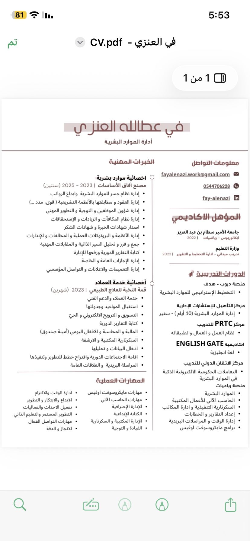 أتقدم الى عمل موارد بشرية جاهز ومتاح للعمل فورا أو دوام جزئي، خبرة 2 سنوات بمجال الموارد البشرية، اعمل في جميع المنصات الحكومية بالمملكة (قوي، مدد، مقيم، ابشر، gosi، طاقات، المركز السعودي للأعمال، تم، هدف دعم التوظيف، الخ) لدي قدرة على عمل تطوير شامل بإدارة الموارد البشرية (الخرج)