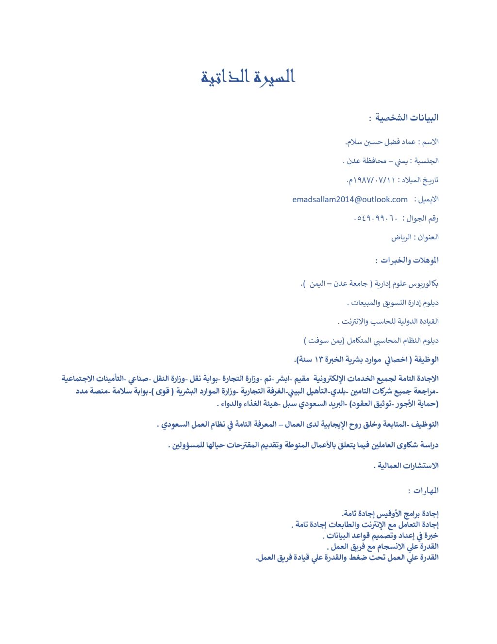 الوظيفة (أخصائي موارد بشرية الخبرة 13 سنة) الاجادة التامة لجميع الخدمات الالكترونية مقيم - ابشر - تم - وزارة التجارة - بوابة نقل - وزارة النقل - صناعي - التأمينات الاجتماعية - مراجعة جميع شركات التأمين - بلدي - التأهيل البيئي - الغرفة التجارية - وزارة الموارد البشرية (قوى) بوابة سلامة - منصة مدد (حماية الأجور - توثيق العقود) البريد السعودي سبل - هيئة الغذاء والدواء. التوظيف - المتابعة وخلق روح الايجابية