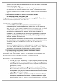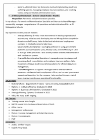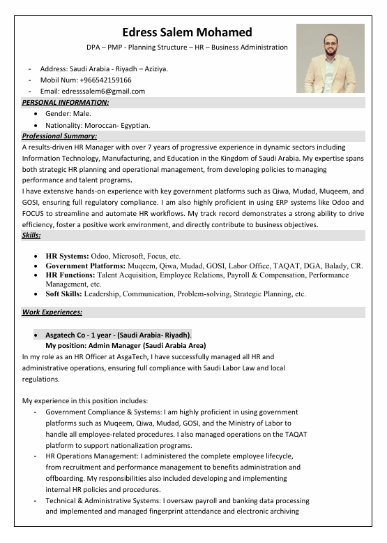 مسؤول موارد بشرية / مدير اداري ابحث عن عمل بخبرة أكثر من 7 سنوات داخل المملكة العربية السعودية في قطاعات تقنية المعلومات، التصنيع، والتعليم خبرة كاملة في شؤون الموظفين والالتزام بنظام العمل السعودي والعمل على المنصات الحكومية (قوى، مقيم، مدد، التأمينات، طاقات مكتب العمل، بلدي) اجادة التوظيف، الرواتب الحضور والانصراف، السعودة، اعداد اللوائح والسياسات، وأنظمة ERP مثل Odoo وFOCUS. ابحث عن فرصة عمل
