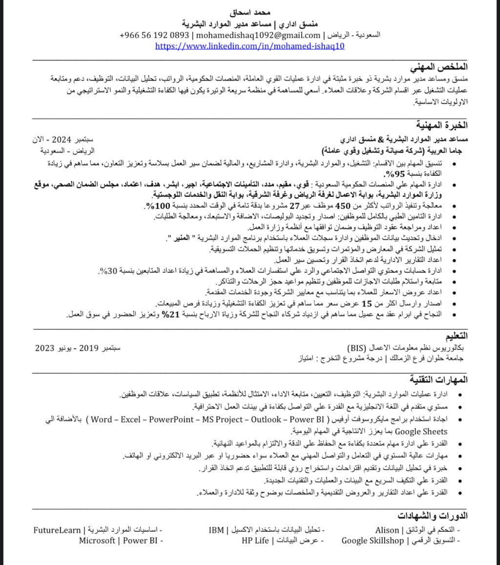 ابحث عن عمل اداري أو في قسم الموارد البشرية لدي خبرة في الأعمال الادارية والموارد البشرية، تشمل إدارة شؤون الموظفين، الرواتب، المنصات الحكومية، اعداد التقارير، والتنسيق بين الأقسام. أجيد استخدام برامج Microsoft Office، وأتمتع بمستوى جيد جدا في اللغة الانجليزية، مع القدرة على العمل في بيئات سريعة الوتيرة. لدي اقامة سارية لمدة سنة وجاهز للعمل مباشرة