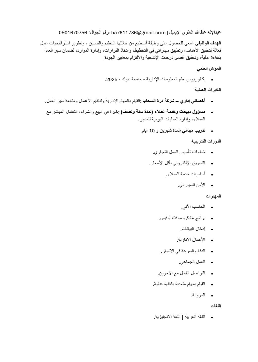 مستعد للعمل فورا الخرج أو الرياض تتخصصي يجمع بين الادارة والتقنية وعندي خبرة CV أمامكم