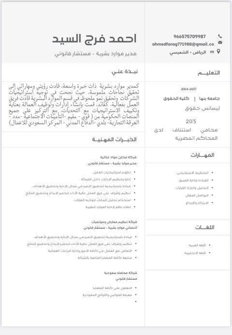 محامي استئناف مصري متواجد في الرياض خبرة 9 سنوات بالمحاماة علي دراية تامة بالقانون السعودي والأنظمة السعودية إقامة سارية خبرة في جميع المنصات الحكومية اشتغلت أخصائي موارد بشرية علي جميع المنصات الحكومية (قوي مقيم التأمينات ابشر ناجز تراضي مكتب العمل مدد جسر الغرفة التجارية بلدي تم سلامة) ابحث عمل كمستشار قانوني أو أخصائي موارد بشرية وادارية