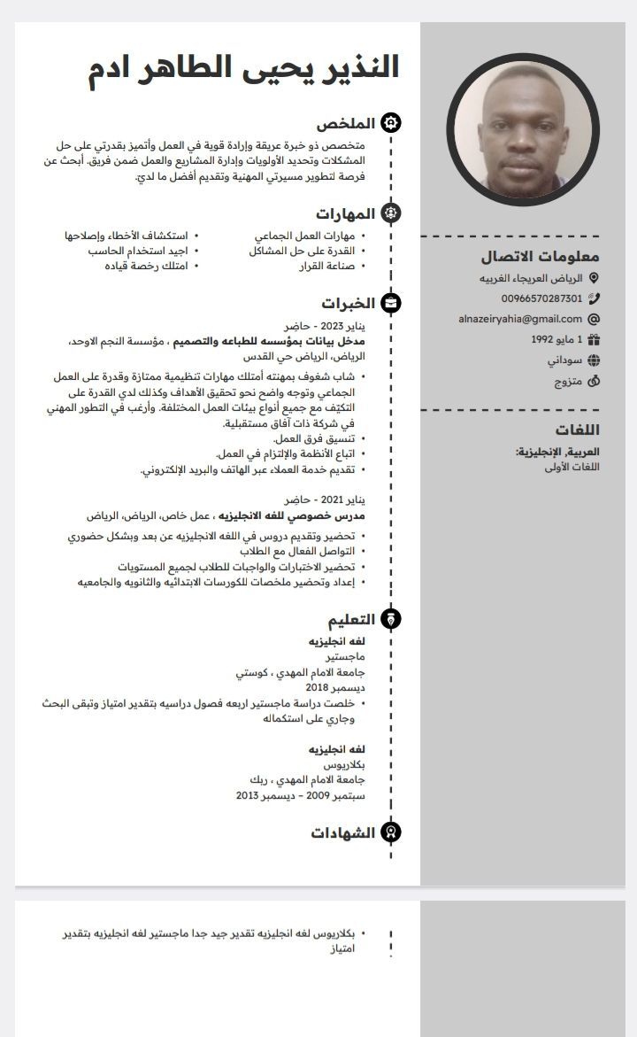 Sudanese Public service employer with good experience is looking for a job has experience in the following government platforms Absher, Najiz, Qawi, Gwazat, Insurance, Vehicle Insurance and Transfer, Visit Extensions, etc. fluent in spoken and written English