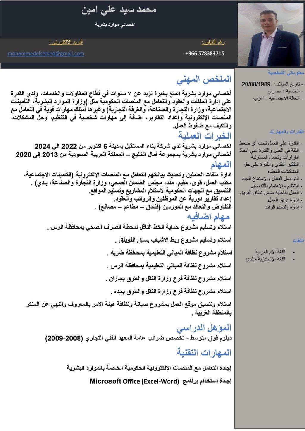 أخصائي موارد بشرية بخبرة تزيد عن 7 سنوات في مجال المقاولات العامة، أجيد التعامل مع جميع المنصات الحكوميه، أجيد التعامل مع برنامج مايكروسوفت أوفيس، اعداد التقرير الدوريه عن الموظفين ومناقشتها مع الادارة، اعداد مسيرات الرواتب، اعداد مستخلصات المشاريع الحكوميه، تدريب الموظفين الجدد، القدرة علي العمل تحت ضغط، الانظباط في العمل