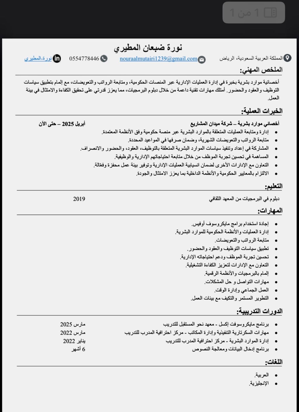 معكم نوره المطيري أنا واثقة من أن مؤهلاتي وخبراتي تجعلني مرشحا مثاليا عندي خبرة أخصائية موارد بشرية
