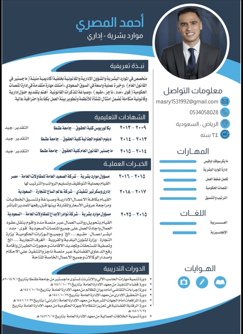 ابحث عن عمل متخصص في الموارد البشرية والخدمات الادارية بخبرة تتجاوز عقد من الزمان، أجمع بين الكفاءة الادارية والخبرة القانونية. متمكن من إدارة شؤون الموظفين والتعامل الاحترافي مع كافة المنصات الرقمية الحكومية السعودية، ملتزم بتحسين الأداء التنظيمي وضمان سير العمل وفقا للمعايير القانونية والادارية الحديثة. مرفق السيرة الذاتية)