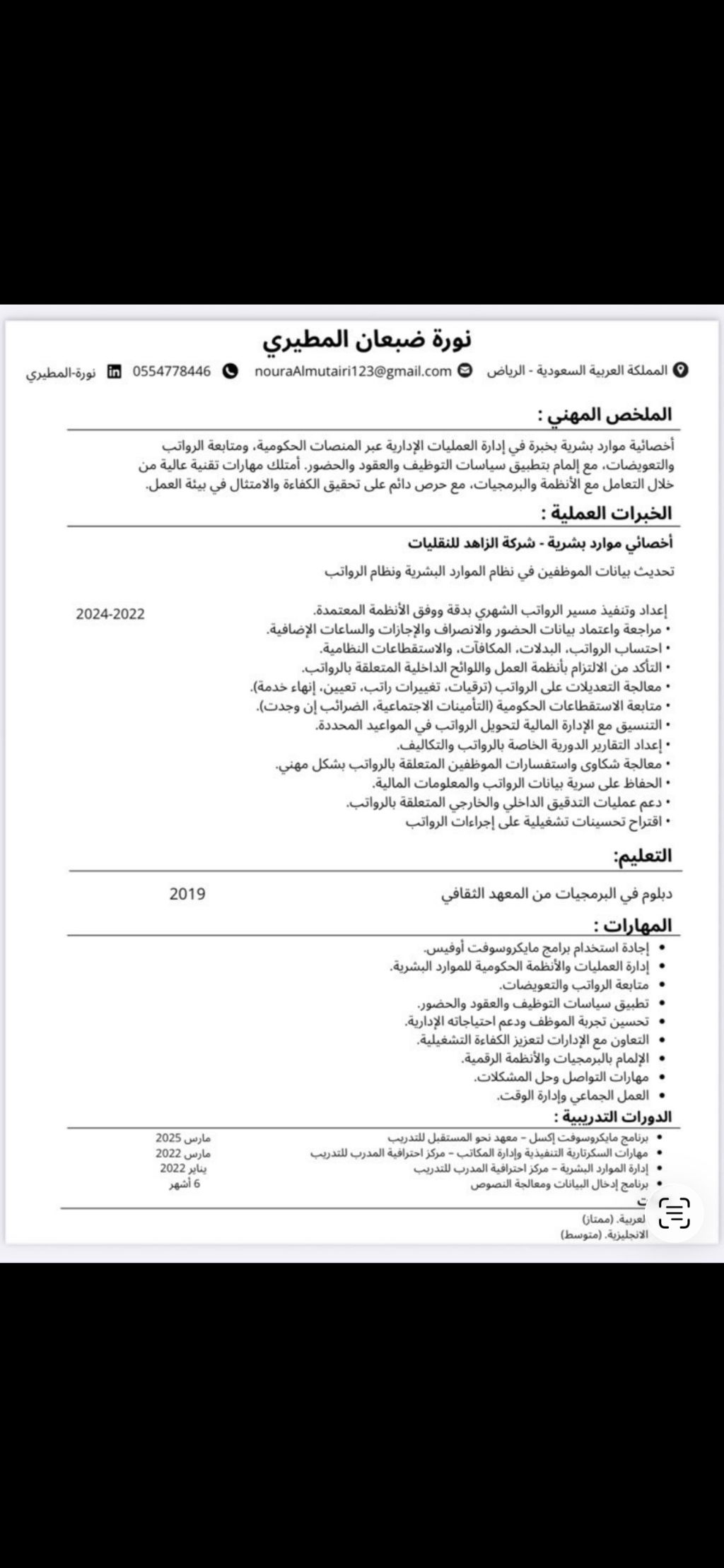 أنا نورة المطيري، أخصائية موارد بشرية بخبرة في إدارة كشوف المرتبات والعمليات الادارية عبر المنصات الحكومية. وأيضا منصات الحكومية أتابع نجاحات وأرغب في استكشاف فرص التعاون معكم. أرفق لكم سيرتي الذاتية، وأسعد جدا بالتواصل معكم لمناقشة كيف يمكن لخبرتي في حوكمة الموارد البشرية أن تضيف قيمة لفريقكم. شكرا لك