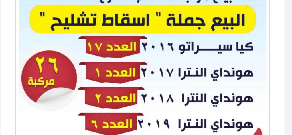 سيارات للبيع بالجملة، سيارات تسقيط وتشليح، قطع غيار وملحقات. قطع غيار للبيع بالجملة بأسعار خاصة. البيع تفريدي: النترا بسعر 23 ألف، كيا بسعر 10 آلاف. البيع بالجملة بأسعار خاصة. للبيع: 25 سيارة كيا وهيونداي، موديلات 2016-2017-2018-2019. كيا سيراتو: 17 سيارة. هيونداي النترا: 8 سيارات. تسقيط المركبات ونقلها على عاتقنا. تستلمها في التشليح جاهزة. لا يوجد نقل خاص. البيع لأعلى سعر. التواصل عبر واتساب فقط، لا أستقبل اتصالات هاتفية.