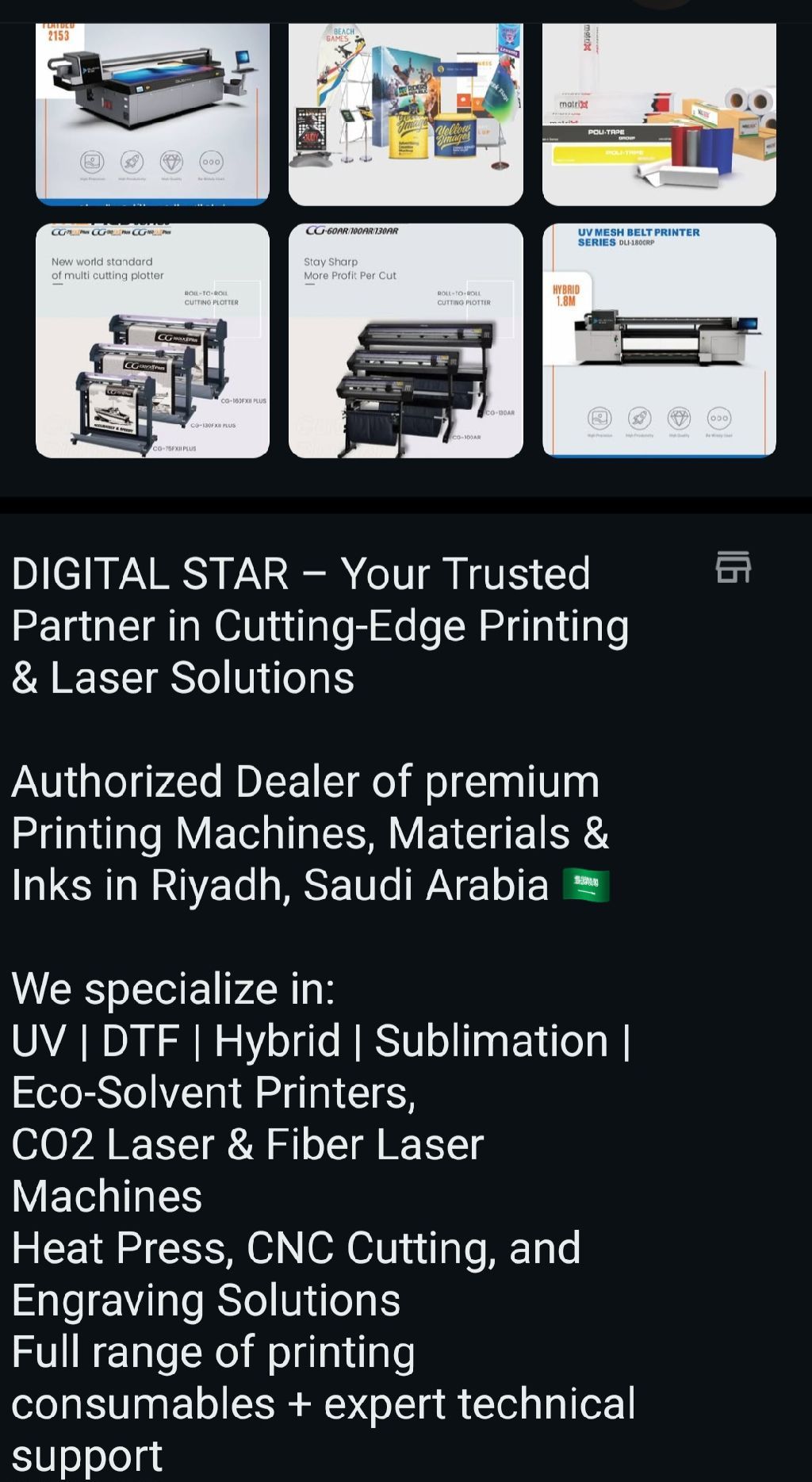 Digital Star - Your Trusted Partner in Cutting - Edge Printing & Laser Solutions Authorized Dealer of premium Printing Machines, Materials & Inks in Riyadh, Saudi Arabia We specialize in UV DTF Hybrid Sublimation Eco - Solvent Printers, CO2 Laser & Fiber Laser Machines Heat Press, CNC Cutting, and Engraving Solutions Full range of printing consumables + expert technical Asem iraqi