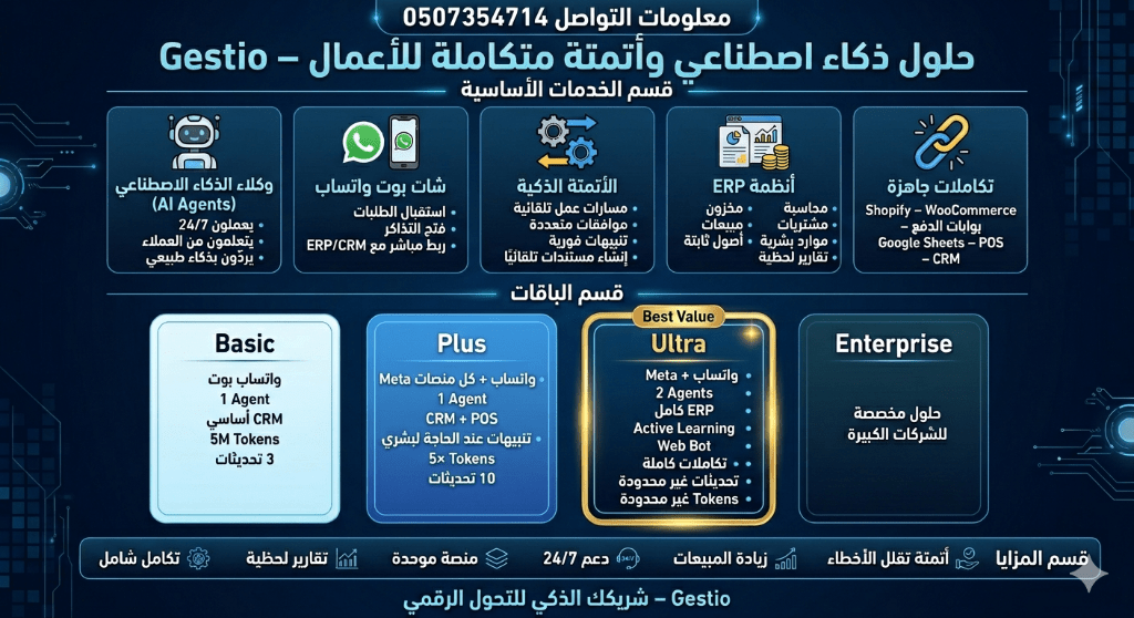 جستيو شريكك الذكي للتحول الرقمي واتمتة الأعمال هل تبحث عن طريقة ترفع فيها مبيعاتك، تقلل التكاليف، وتقدم خدمة عملاء أسرع بدون توظيف اضافي حلول Gestio تجمع لك بين الذكاء الاصطناعي + الأنظمة الادارية + الأتمتة في منصة واحدة تساعدك تنمي مشروعك بثقة. خدماتنا وكلاء ذكاء اصطناعي (AI Agents) يعملون كموظفين رقميين 24 / 7 شات بوت واتساب متكامل مع ERP وCRM اتمتة كاملة للعمليات من الطلب الى التحصيل، ومن الشراء