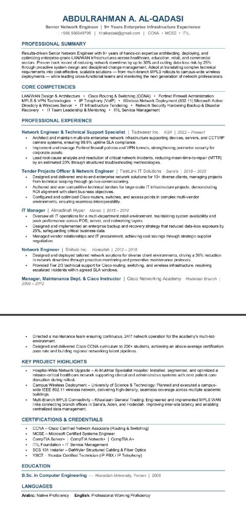 أنا مهندس حاسب لدي خبرة في تقنية المعلومات والشبكات ولدي شهادة CCNP عملت في جهات مختلفة (طبية - استثمارية - تعليمية - ناشئة - بنوك) مسؤول عن فريق مباشر مكون من 12 مهندس بالاضافة لفرق غير مباشرة مكونة من 30 شخص ما بين (مبرمج - مهندس - فني) قللت عدد البلاغات بنسبة 30% - أدرت ميزانية تقدر ب 50 مليون ريال لافتتاح 15 فرع - زيادة مستوى رضا العملاء من 92% الى 97%
