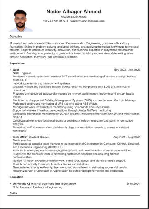 أنا مهندس الكترونيات واتصالات اعمل في مجال تشغيل ومراقبة الشبكات كنظام NOC Engineer، لدي خبرة في المراقبة على مدار الساعة، إدارة الأعطال، اعداد التقارير، والعمل على أنظمة BMS وSCADA وUPS. امتلك مهارات تحليلية قوية، خبرة في أدوات المراقبة، والعمل ضمن فريق، وأسعى للتطور المستمر واضافة قيمة حقيقية لبيئة العمل الاحترافية مع الالتزام بمعايير الجودة والدقة وتحمل المسؤولية والسعي للتميز المهني دائما