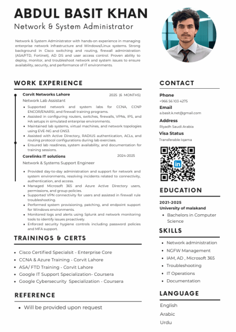 Find attached my CV for the position of IT support/ Network Technician. I have experience in IT support, networking, and system troubleshooting, along with CCNA knowledge. I would appreciate the opportunity to discuss how my skills can support your team. Thank you for your time and consideration. Best regards, Azmat Awan