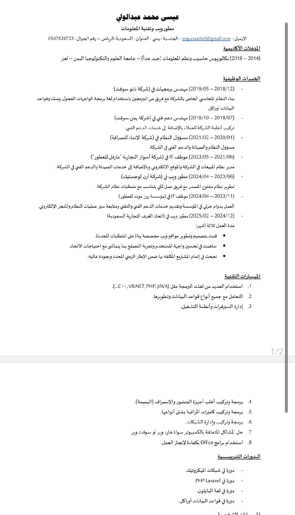 أنا عيسى مقيم يمني الجنسية ابحث عن عمل في مجال IT وبرمجة مواقع الويب مرفق السيرة الذاتية لدي خبرة 7 سنوات في مجال تقنية المعلومات وامتلك رخصة قيادة سارية المفعول