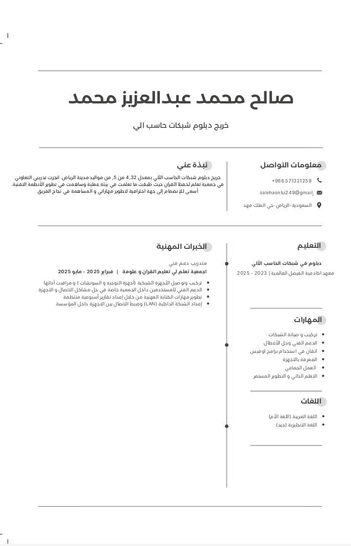 باحث عن فرصة وظيفية في مجال الدعم الفني أو الشبكات تخرجت مؤخرا بدرجة دبلوم شبكات الحاسب الآلي بمعدل 4.32 من 5، ولدي شغف كبير بمجال الشبكات والدعم الفني، وأسعى لفرصة ابدأ بها مسيرتي المهنية وأسهم فيها بتطبيقي العملي لما تعلمته تركيب وصيانة الشبكات الدعم الفني للمستخدمين التعامل مع أنظمة التشغيل الأساسية مهارات تواصل ممتازة العمل ضمن فريق وتحت الضغط أنا شغوف بالتعلم والتطور، وجاهز للعمل والآن