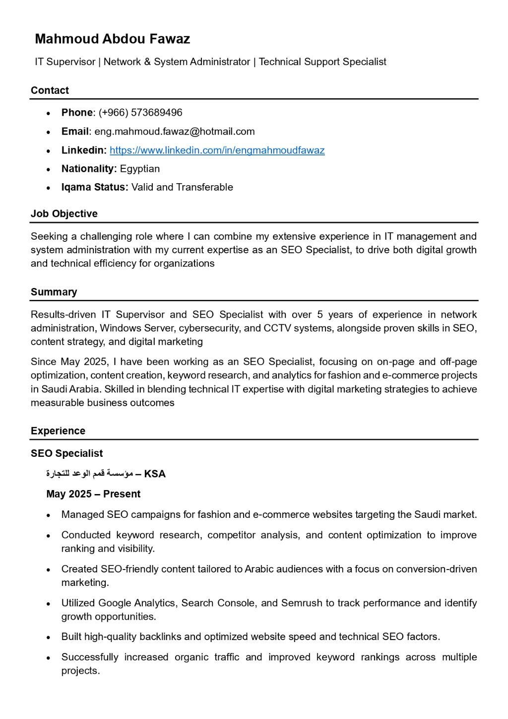 أنا محمود فواز، مشرف تقنية معلومات (IT Supervisor) وأخصائي تحسين محركات بحث (SEO Specialist) بخبرة تتجاوز خمس سنوات في إدارة الأنظمة والشبكات، الأمن السيبراني، وصيانة أنظمة المراقبة (CCTV) بالاضافة الى خبرة عملية حديثة في تحسين أداء المواقع الالكترونية ورفع تصدرها في نتائج البحث، خاصة في مجال الأزياء والتجارة الالكترونية داخل السوق السعودي. ابحث عن فرصة عمل مناسبة داخل المملكة العربية السعودية في