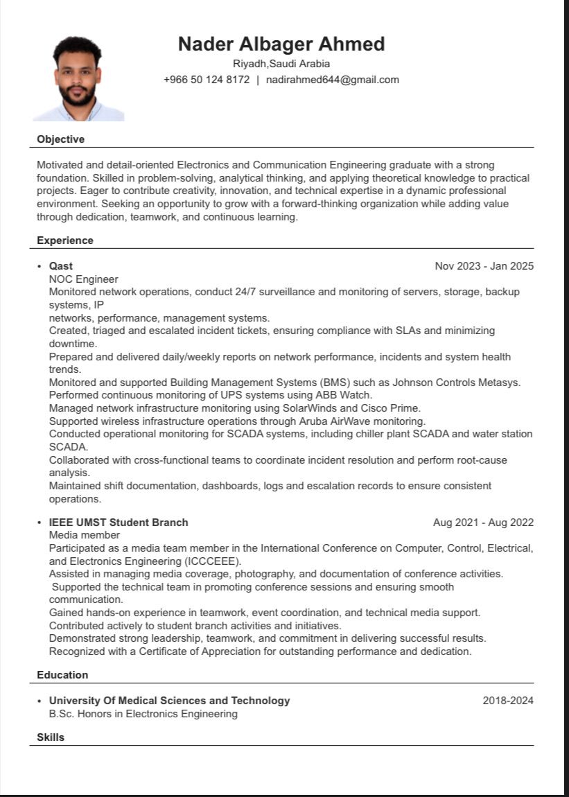 أنا مهندس الكترونيات واتصالات اعمل في مجال تشغيل ومراقبة الشبكات كنظام NOC Engineer، لدي خبرة في المراقبة على مدار الساعة، إدارة الأعطال، اعداد التقارير، والعمل على أنظمة BMS وSCADA وUPS. امتلك مهارات تحليلية قوية، خبرة في أدوات المراقبة، والعمل ضمن فريق، وأسعى للتطور المستمر واضافة قيمة حقيقية لبيئة العمل الاحترافية مع الالتزام بمعايير الجودة والدقة وتحمل المسؤولية والسعي للتميز المهني دائما