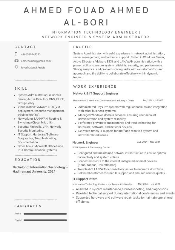 مهندس شبكات دعم فني يبحث عن عمل خبرة عملية مهندس شبكات ودعم فني حاصل على بكالوريوس تقنية معلومات، لديه خبرة عملية في إدارة الشبكات (LAN / WAN) الدعم الفني وصيانة الأنظمة. خبرة في Windows Server Active Directory اعداد الشبكات، وحل الأعطال التقنية للمستخدمين ملتزم بالعمل، سريع التعلم، وقادر على العمل تحت الضغط وبروح الفريق. جاهز للعمل فورا داخل الرياض أو أي مدينة مناسبة. للتواصل