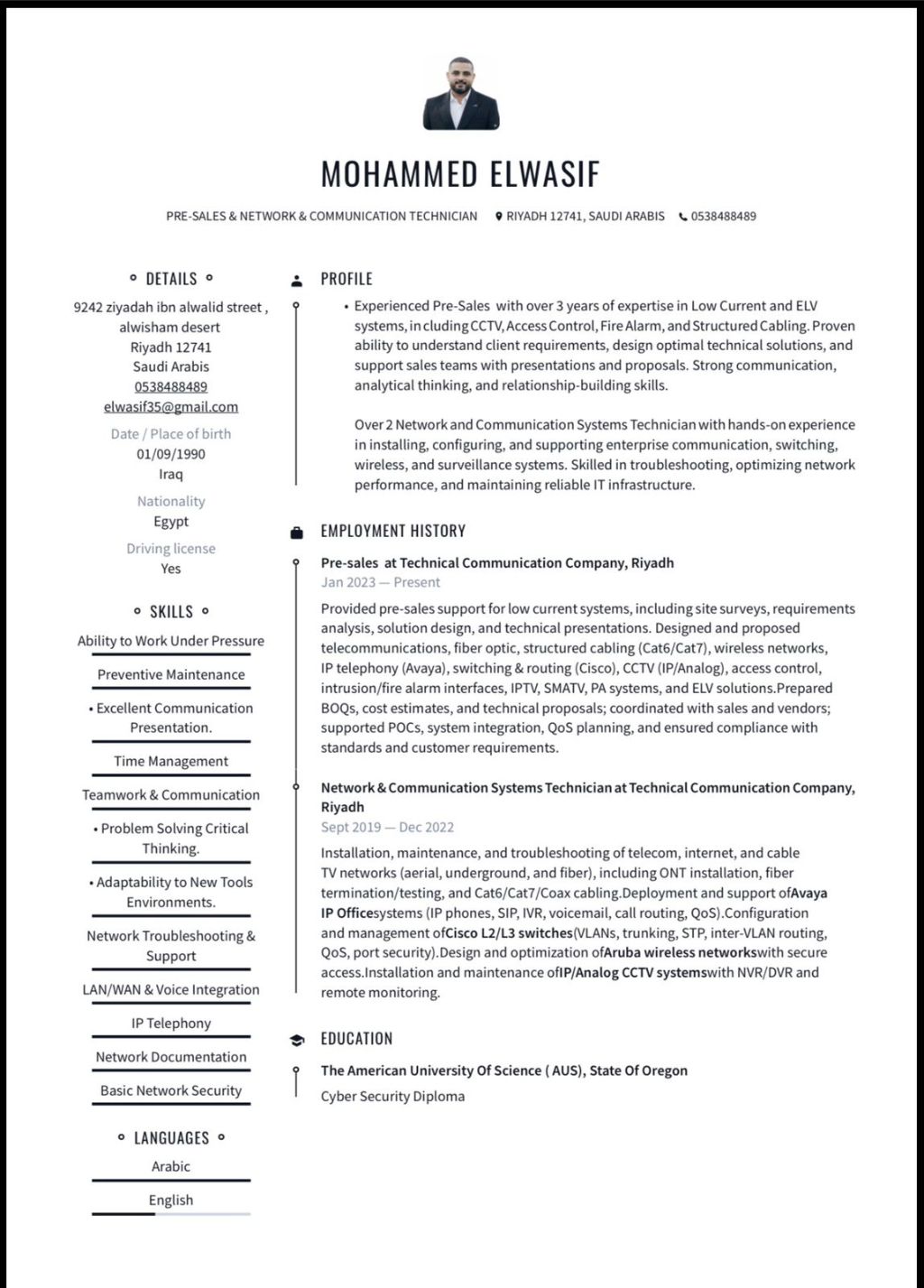 خبرة في مجال ما قبل البيع لأكثر من 3 سنوات في أنظمة التيار المنخفض والجهد المنخفض للغاية بما في ذلك أنظمة الدوائر التلفزيونية المغلقة، وأنظمة التحكم في الدخول، وأنظمة انذار الحريق، وأنظمة الكابلات الهيكلية. قدرة مثبتة على فهم متطلبات العملاء، وتصميم حلول تقنية مثالية، ودعم فرق المبيعات من خلال العروض التقديمية والمقترحات. مهارات تواصل قوية، ومهارات تحليلية، ومهارات بناء علاقات ممتازة. أكثر من سنتين