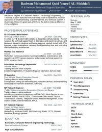 حاصل على درجة البكالوريوس في هندسة شبكات الحاسوب، أخصائي دعم فني لتقنية المعلومات والشبكات خبرة تزيد عن ثلاث سنوات، خبرة عملية في استكشاف الأخطاء وأصالحها خبرة عملية في خدمة العملاء والدعم الفني، وتركيب كاميرات المراقبة أحب عملي، وأعرف أهدافي جيدا، لدي المهارات الكافية لأحداث فرق في مكان عملي