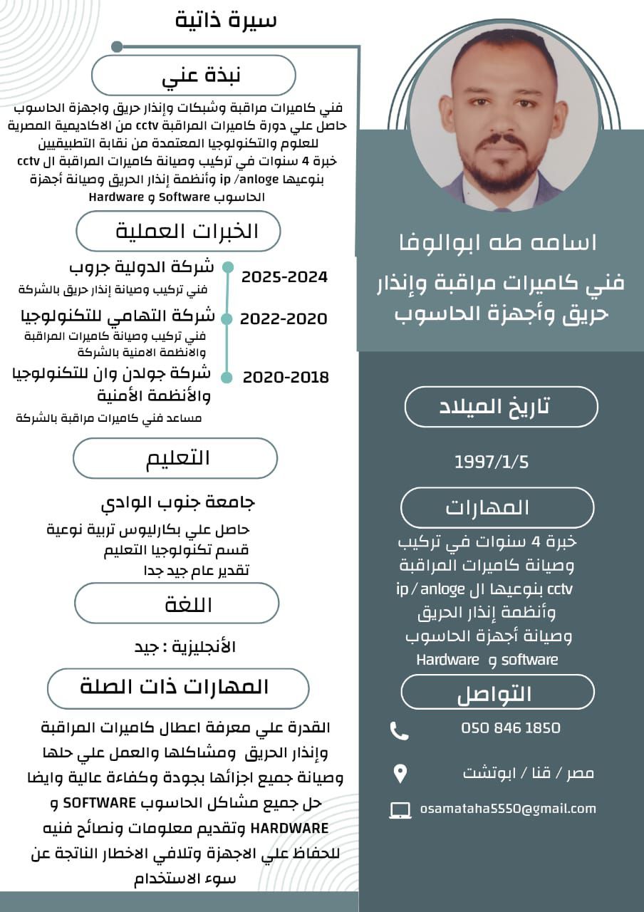 فني كاميرات مراقبة وشبكات وانذار حريق واجهز الحاسوب حاصل على دوره كاميرات مراقبه CCTV من الأكاديمية المصريه للعلوم والتكنولوجيا المعتمده من نقابة التطبيقين خبرة 4 سنوات في تركيب وصيانة كاميرات المراقبه أل CCTV بأنواعها