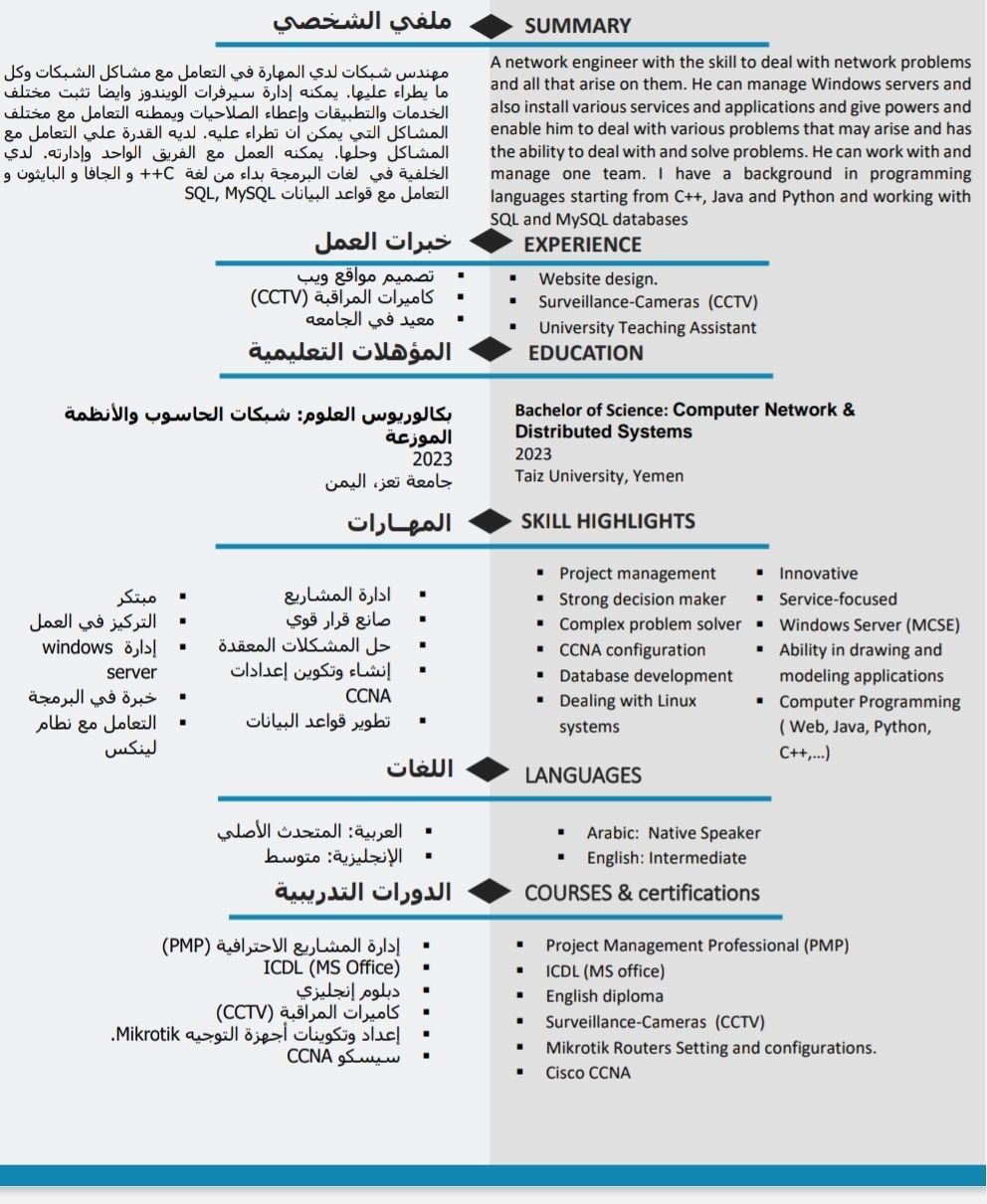 مهندس تقنية معلومات وشبكات درجة البكالوريوس لدي خبرة في إدارة الشبكات والسيرفرات والبرمجة وتصميم مواقع الويب، وكاميرات المراقبة CCTV واجهزة البصمة ودبلوم إدارة المشاريع PMP والدعم الفني