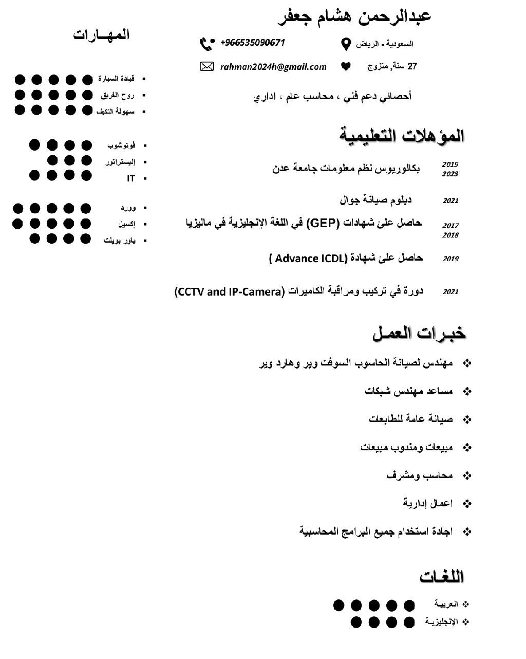 معكم عبد الرحمن من اليمن، مهندس كمبيوتر ولابتوب ودعم فني ومحاسب عام، ابحث عن عمل في الرياض