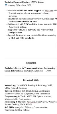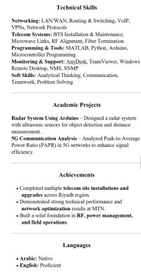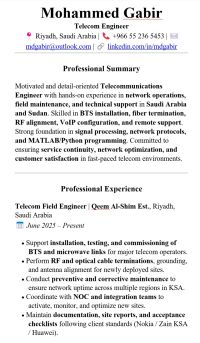 أنا محمد جابر - مهندس شبكات اتصالات، حاصل على بكالوريوس هندسة شبكات اتصالات ابحث عن فرصة عمل في مجال الشبكات أو الدعم الفني أو الاتصالات داخل الرياض أو أي منطقة أخرى بالمملكة. امتلك مهارات في إدارة وصيانة الشبكات السلكية واللاسلكية استخدام Office 365 وExcel تحليل الأعطال وحل المشكلات التقنية التعامل مع الحاسوب باحترافية للتواصل