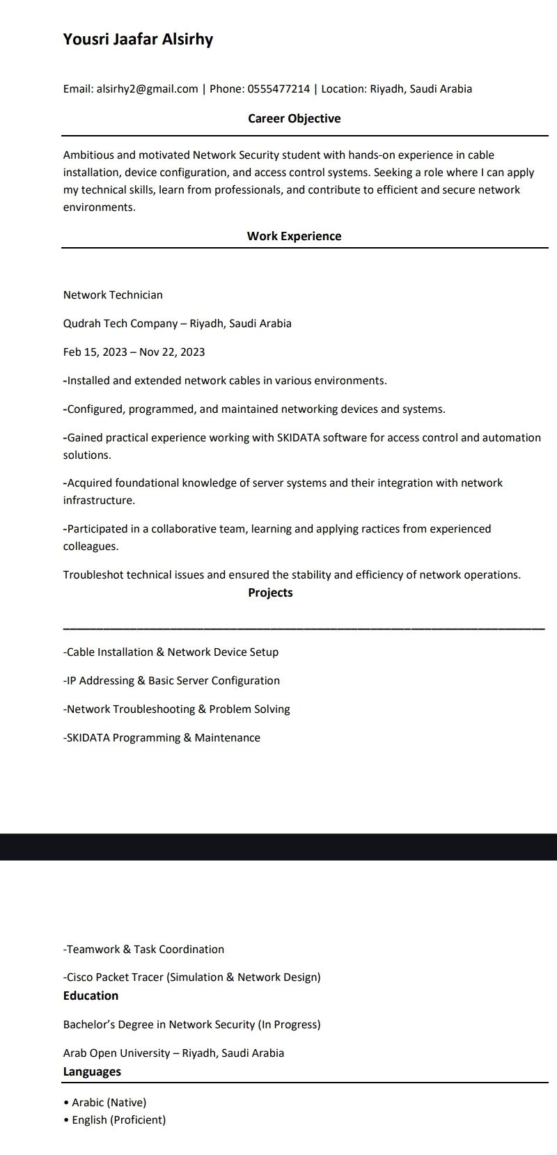 حاصل على معرفة جيدة في أساسيات الشبكات، وتشخيص أعطال الشبكة وحلها. امتلك فهما لمفاهيم IP Addressing وSubnetting، والقدرة على العمل ضمن فريق، والالتزام بالمهام الموكلة