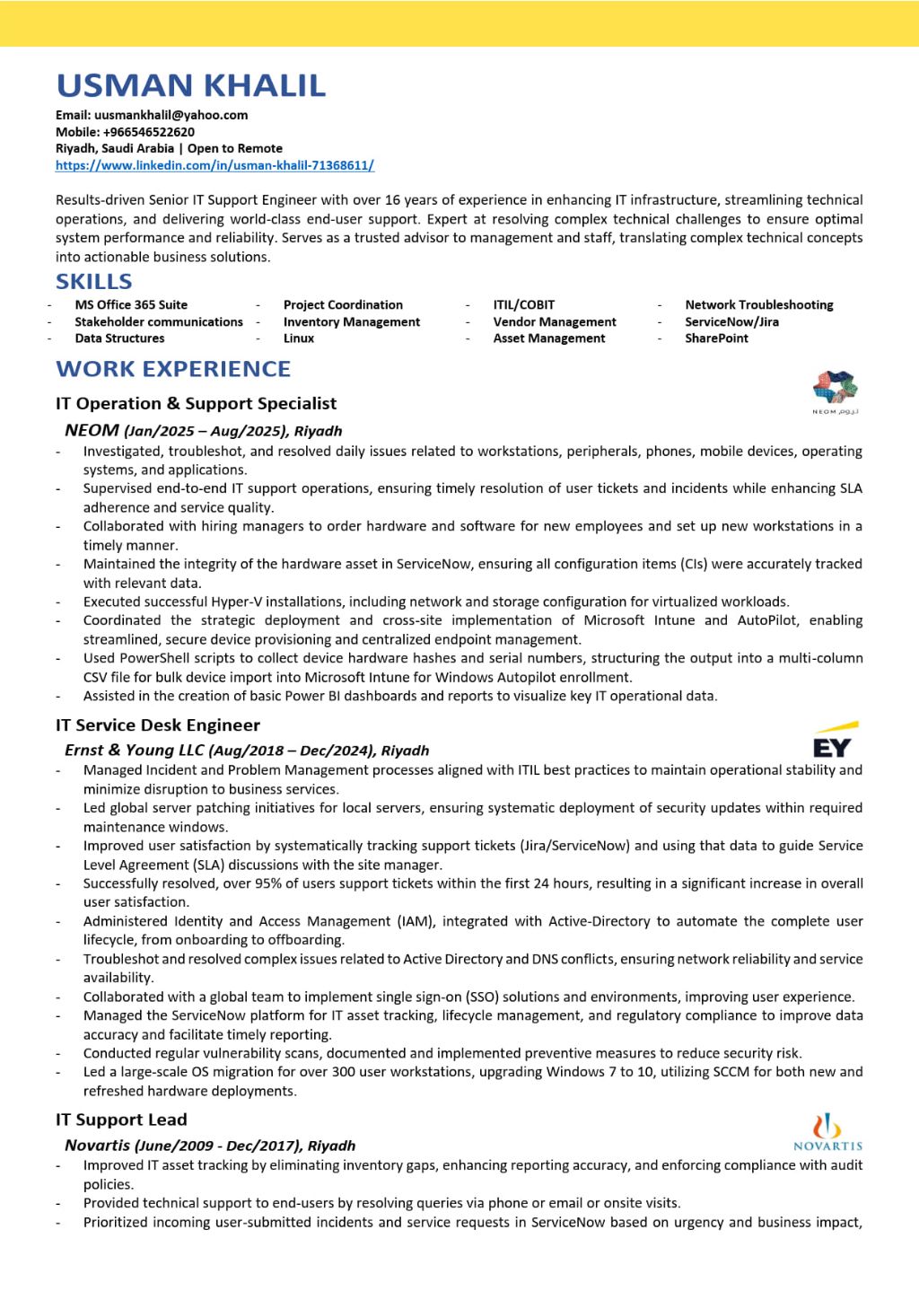 Hi, I am results - driven Senior IT support Engineer with over 16 years of experience in enhancing IT infrastructure, streamlining technical operations, and delivering world - class end - user support. Expert at resolving complex technical challenges to ensure optimal system performance and reliability. Please review my linkedin profile. I am available in Riyadh city. I have transferable Iqama and