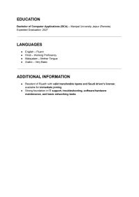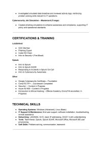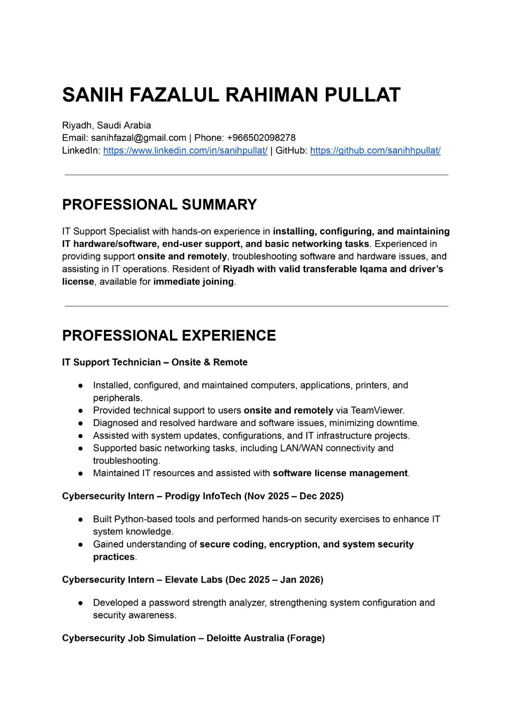 IT support/ IT Technician/ Junior Cybersecurity (Entry - Level) I am seeking an opportunity in IT support or IT Technician roles, with openness to entry - level cybersecurity responsibilities. I have hands - on experience in IT support both onsite and remotely, including troubleshooting Windows systems, networking, and user support. I have completed cybersecurity internships with multiple companies, and