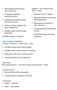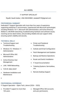 Job Seeking IT support Specialist I have more than 3 years of experience in IT support. I have strong skills in Microsoft Office and good knowledge of E Services, computer systems, and troubleshooting technical issues. I am looking for a suitable job opportunity and can join immediately. Contact Phone Email Current Location Riyadh, Saudi Arabia