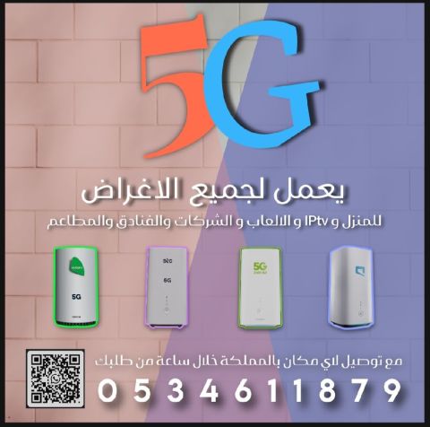 انترنت لا محدود (مفتوح) مع راوتر 5G، مع سياسة استخدام غير عادل، يعمل لجميع الأغراض (للمنازل وال IPtv والمدارس والجامعات والجايمرز محبي البينق المنخفض والشركات والمؤسسات والفنادق والكافيهات) جميع الشركات لدينا (أس تي سي سوا STC, موبايلي، زين، سلام) فترة تجربة من 48 ساعة الى 72 ساعة حسب الشركة المختارة، مناديبنا في كل مكان في المملكة توصل في خلال ساعة زمن للتواصل واتساب ومكالمات