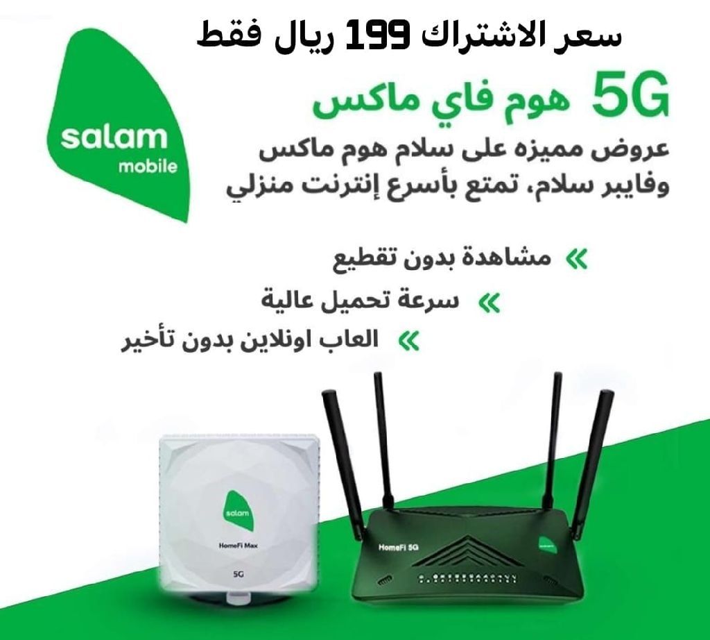 عروض مميزة من شركة سلام للانترنت هوم ماكس وفايبر تمتع بأسرع انترنت منزلي لا محدود وسرعات وجودة عالية التركيب والتوصيل خلال يوم ب 199 ريال فقط مشاهدة بدون تقطيع سرعات تحميل عالية ألعاب اونلاين بدون تأخير سلام هوم فاي ماكس - فايبر سلام بسرعات فائقة وبنعطيك مودم مع التوصيل والشريحة مجانا