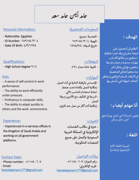 ابحث عن وظيفة في أي مجال مناسب (مبيعات - استقبال - خدمات الكترونية - خدمة عملاء) عمري 27 سنة، وأجيد استخدام الحاسب الآلي واللغة الانجليزية لدي مهارات تواصل ممتازة وخبرة في التعامل مع العملاء. جاهز للعمل فورا