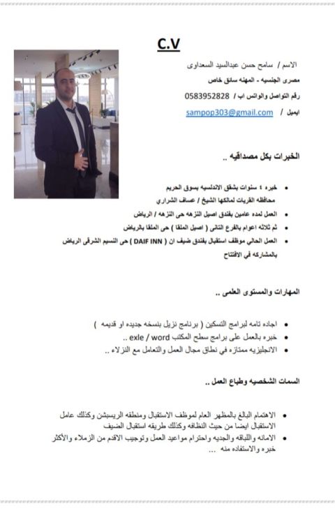موظف استقبال شقق فندقية مصري لبق حسن المظهر بفضل الله وحريص على عملي جدا أجيد التعامل على نزيل قديم أو جديد وبرنامج مبيت وزائر. برامج مكتبيه اكسل وورد خبرة طويله بالمجال حريص لله الحمد