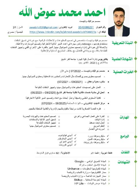 Accountant residing in the Kingdom of Saudi Arabia with one year of hands - on experience in financial accounting. Holder of a Bachelor’s degree in commerce (English Section - Accounting) Proficient in using Microsoft Excel and accounting software, with experience in preparing journal entries, bank reconciliations, invoices, and account follow - ups. I am disciplined, detail - oriented, and a fast