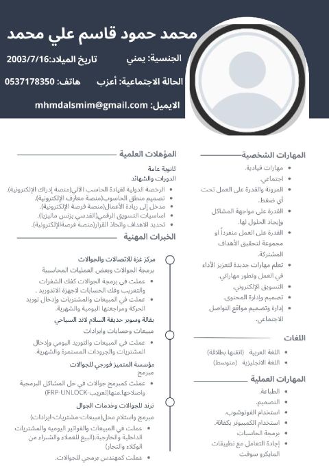 Mohamed Gamal Sayed، 0538433169 Single, 26 years old، Residing in Riyadh، Former Sales and Marketing Representative at، CMB Building Materials and Insulation Company - Cairo from 2022 to 2024، Languages Arabic and English، Bachelor of Business Administration - Finance and Investment Department، I am seeking a position as a Sales and Marketing Representative
