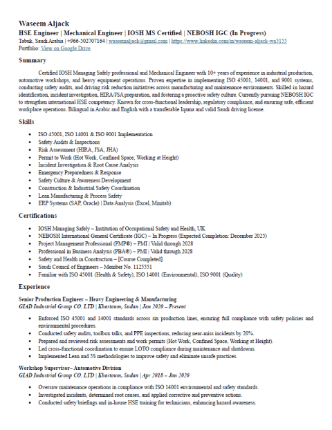 Certified IOSH Managing Safely professional and Mechanical Engineer with 10 + years’ experience in production, automotive, and heavy equipment operations. Skilled in ISO 45001, 14001, and 9001, safety audits, risk assessment, and incident investigation. Pursuing NEBOSH IGC to enhance HSE expertise. Bilingual (Arabic/ English) with transferable Iqama and valid Saudi license