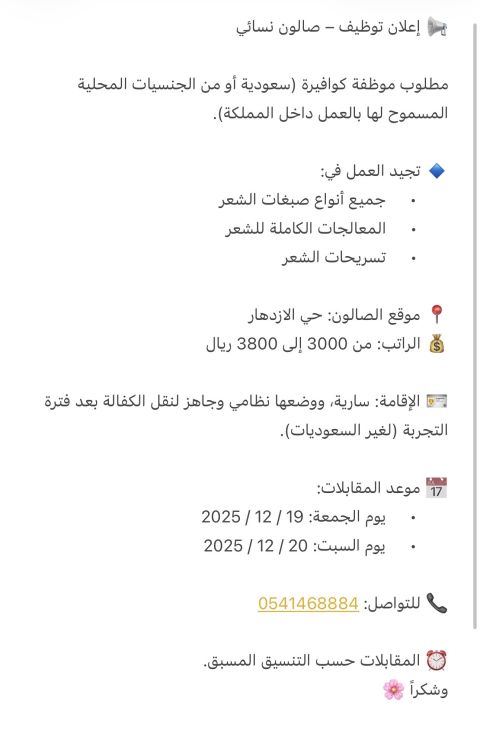 شاغر وظيفي نسائي مسوقة بالصوت ومصورة ولها خبرة راتب 2500 مع نسبة صالون غرب الرياض حي الموسى دوام كامل
