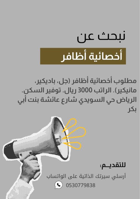 We Are Hiring High - end salon in North Riyadh is looking for a Nail & Lash Specialist (Transferable Iqama) alearid/ alyasmin Send your experience and portfolio