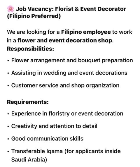 We are looking for a Filipino Employee to work in flower and event decoration in Sakaka, Aljouf KSA