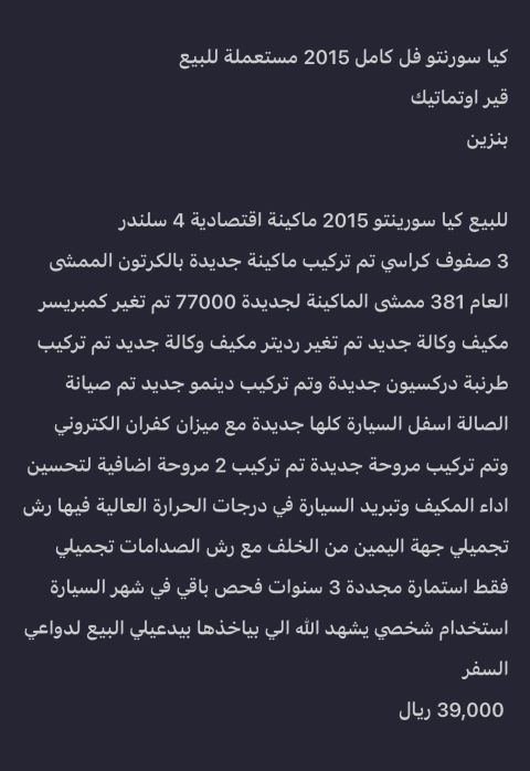 للبيع كيا سورينتو 2015 ماكينة 4 سلندر اقتصادية. تم تغيير الماكينة جديدة وعمل صيانة واستبدال جميع القطع الاستهلاكية. السيارة قمة النظافة للمستخدم. التواصل.