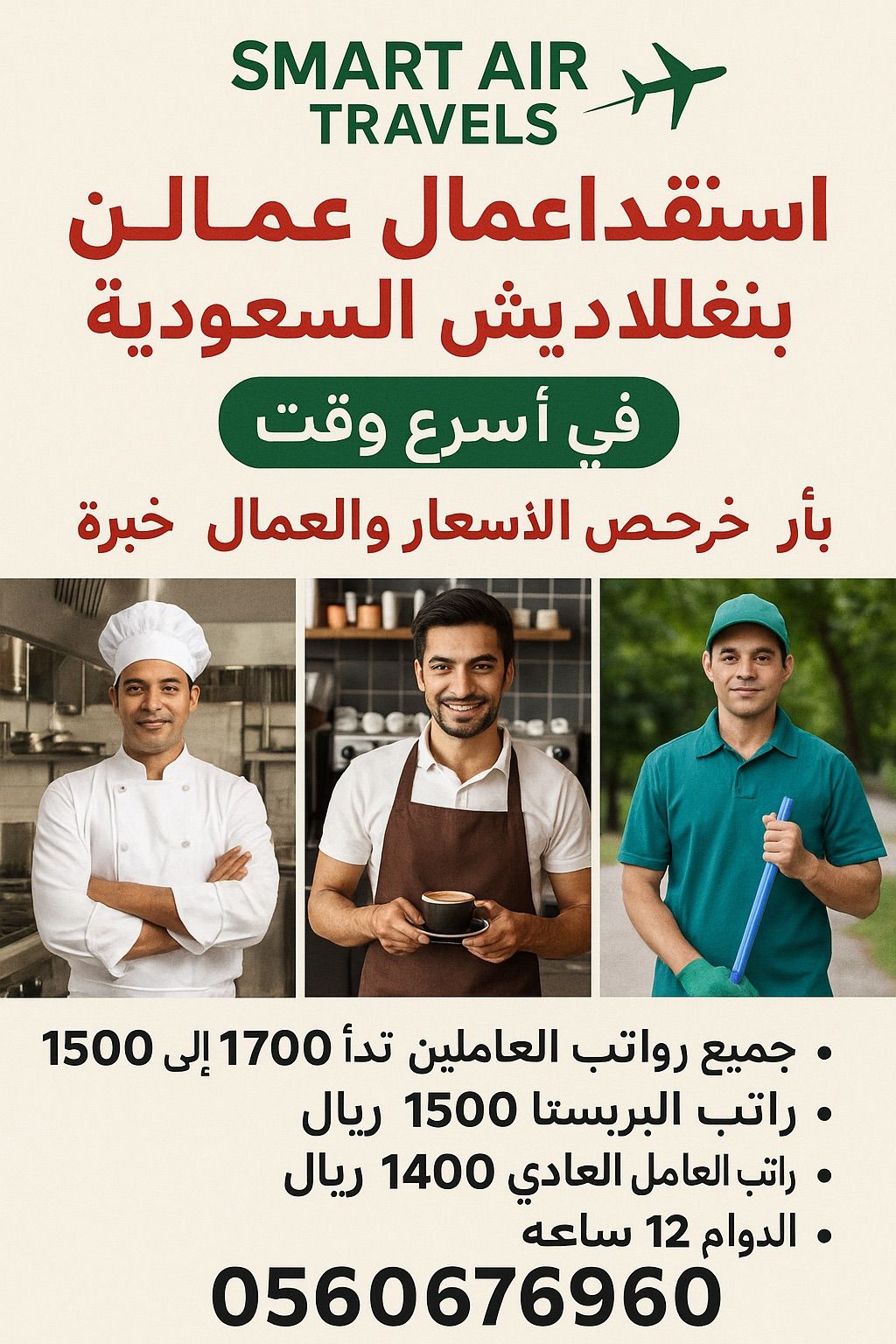 عمالة بنغلاديشية لجميع المهن نوفر لك العمالة الماهرة من بنغلادش الى السعودية ب أسرع وقت وأقل الأسعار جميع المهن عمالة منزلية - عمال مطاعم ومقاهي (باريستا) فنيين (سباكة - كهرباء - صيانة) عمال نظافة - طباخين - عمال مصانع - موظفي فنادق ومحلات اجراءات سريعة أسعار منافسة ضمانات موثوقة مرونة في الاختيار حسب الطلب متوفر لجميع مدن السعودية للتواصل والاستفسار