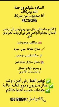 اذا كنتم بحاجة الى عمال مهرة وموثوقين لأي نوع من الأعمال، يمكنكم التواصل معي في أي وقت. نحن نوفر لكم محتاج عمال موثوقين سائقين محترفين عمال نظافة ميكانيكيين عمال منازل تواصل