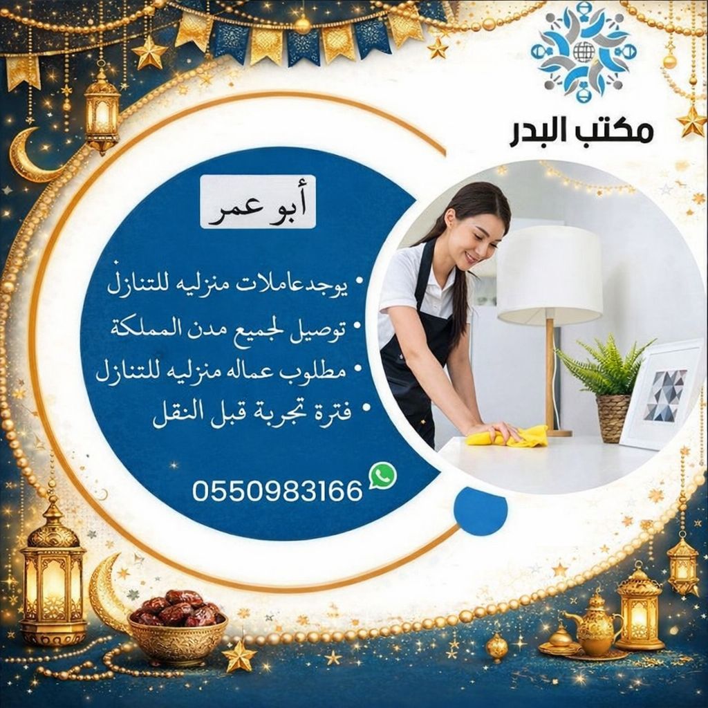 راحتك تبدأ من هنا هل تبحث عن عاملة منزلية موثوقة وخبيرة نوفر لك أفضل الكوادر المدربة من مختلف الجنسيات خبرة عالية في جميع أعمال المنزل تنظيف - ترتيب - غسيل - كوي اتقان الطبخ بمختلف أنواعه عاملات مجربات وذات كفاءة عالية نضمن لك الجودة والراحة سرعة في التوفير وخدمة مميزة للتواصل والاستفسار اختيارك الصح لحياة أسهل