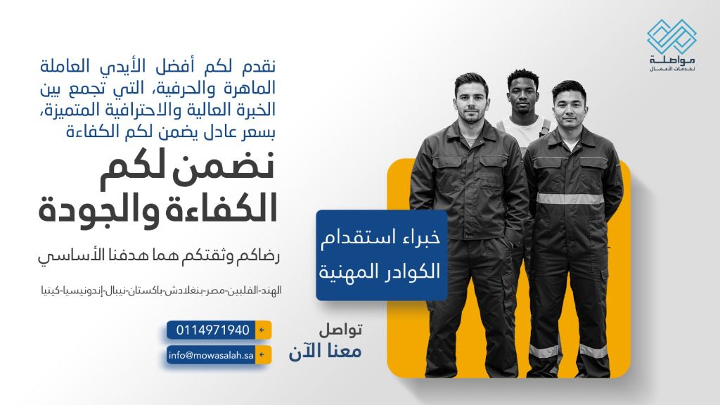 خبرة كبيرة في استقدام العمالة المهنية الهند نيبال الفلبين كينيا مصر بنغلادش أندونيسيا باكستان تونس لكافة الأنشطة في أقرب وقت وبأقل تكلفة مهندس محاسب مشرف مندوب مبيعات سائق خاص سائق تريلا سباك كهربائي باريستا عمال تحميل وتنزيل عمال نظافة وغيرها من المهن ضمان 90 يوم على العمالة نوفر مقابلات مع المرشحين لاختيار أفضل الكوادر